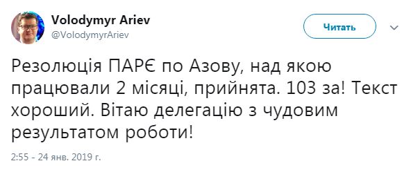 За данную резолюцию проголосовали 103 парламентария, 3 депутата выступили против, а 16 воздержались. "Резолюция ПАСЕ по Азову, над которой работали 2 месяца, принято. 103 за! Текст хороший. Приветствую делегацию с замечательным результатом работы", - написал он.