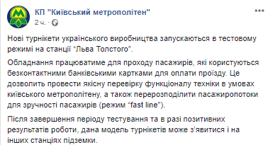 "Оборудование будет работать для прохода пассажиров, которые пользуются бесконтактными банковскими карточками для оплаты проезда. Это позволит провести качественную проверку функционала техники в условиях киевского метрополитена, а также перераспределить пассажиропотоки для удобства пассажиров (режим fast line)", - говорится в сообщении.