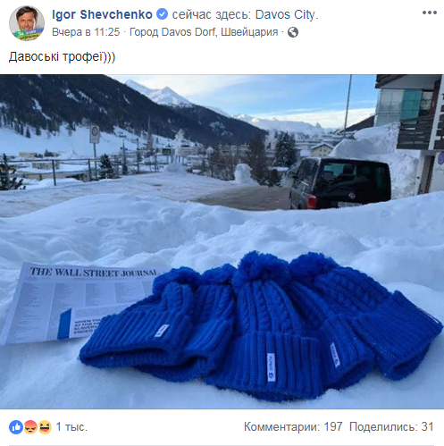 Не скучали в Давосе и другие, прибывшие туда украинцы. Так, кандидат в президенты и экс-министр экологии Игорь Шевченко похвастался, как взял сразу пять бесплатных шапочек из автомата на улице, несмотря на то, что ему пришлось отстоять очередь и повоевать с охранником. Такое рвение он объяснил тем, что его попросили о таком сувенире друзья.
