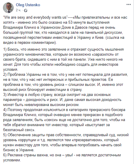 Анализируя спич Кличко экономист Олег Устенко отметил, что "уже никто никого не хочет", потому что в Украине не создаются условия для инвесторов. По его словам, проблема Украины не в том, что у нее нет потенциала для развития, не в отсутствии прибыльных проектов, а в том, что уровень риска слишком высок.