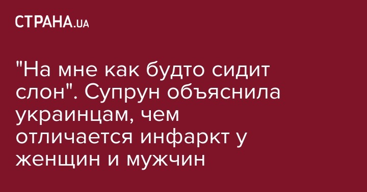 "По данным американских кардиологов, женщины очень боятся не столько инфарктов, как госпитализации. Поэтому они пытаются терпеть боль и дискомфорт, избегают вызвать экстренную медицинскую помощь и тем самым подрывают свое здоровье, теряя очень важное время для применения наиболее эффективных современных методов лечения инфаркта. Помните, чем меньше времени пройдет от начала симптомов до попадания в больницу, тем лучше шансы на выздоровление", - предостерегает глава МОЗ.
