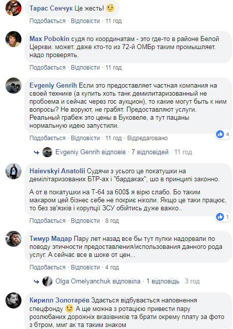 "Частный военкомат", "А деньга тоже в частный карман?", "Оля, ты цены на газ видела???", "Чудесный проект. Завтра обсужу с командованием. И цены влуплю в два раза ниже", "Судя по координатам — это где-то в районе Белой Церкви. Может то-то из 72 ОМБр промышляет", "Покатушки на демилитаризованных БТР и "бардаках" - это законно а вот на Т-64 - верю слабо. если это работает, то без связей и коррупции в ВСУ обойтись очень тяжело", -  пишут пользователи сети.