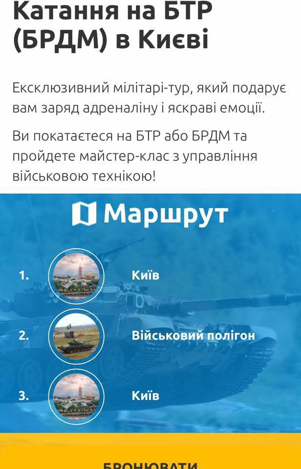 "Я шокирована. Частная контора/турфирма предлагает экстрим на военном полигоне/военной базе в 80 км юго-западнее Киева. Экстрим = катание на военных машинах", - пишет она.