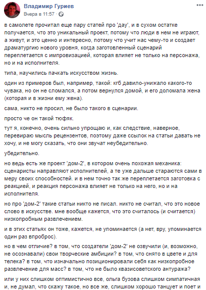 "В самолете прочитал еще пару статей про 'дау', и в сухом остатке получается, что это уникальный проект, потому что люди в нем не играют, а живут, и это ценно и интересно, потому что учит нас чему-то и создает драматургию нового уровня, когда заготовленный сценарий переплетается с импровизацией, которая влияет не только на персонажа, но и на исполнителя. Типа, научились пачкать искусством жизнь.