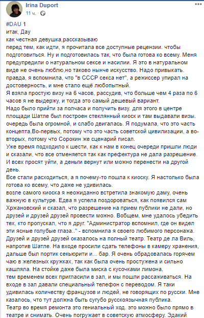 "Тарковский для кадра коров сжигал, а у режиссера "Дау" проститутку для съемок привезли и в кадре насилуют бутылкой. А потом заявляют, что она была не против... (!!!) У меня волосы на голове зашевелились от ужаса. И оправдывается отчего-то этот кошмар тем, что это "ыскуства" и "что дозволено Юпитеру, не дозволено быку", – пишут в Facebook.