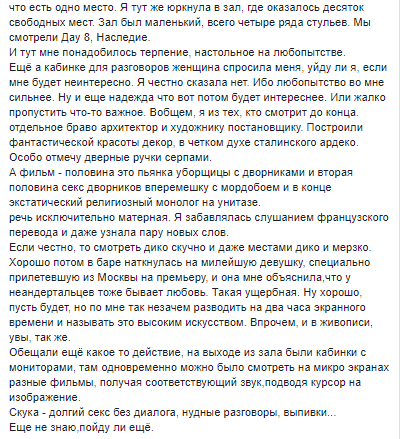 "Как честная девушка, рассказываю. Перед тем, как идти, я прочитала все доступные рецензии. Чтобы подготовиться. Ну и подготовилась так, что была готова ко всему. Меня предупредили о натуральном сексе и насилии. Я это в натуральном виде не очень люблю, но таково нынче искусство. Надо привыкать. Правда, я вспомнила, что "в СССР секса нет", а режиссер упирал на достоверность, и мне стало еще любопытней.