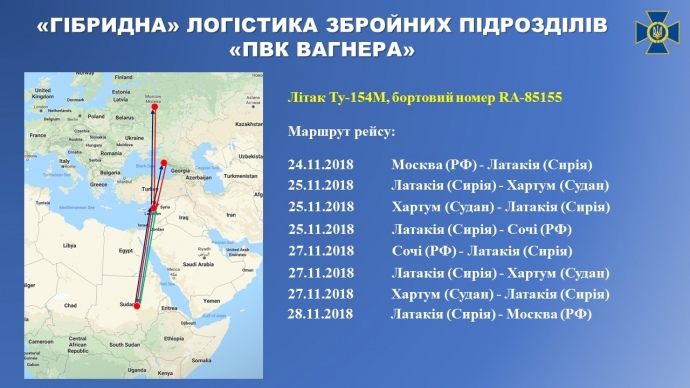 Сообщается, что СБУ владеет доказательствами доставки личного состава и вооружения "ПГК Вагнер" в Судан и другие страны региона авиацией Министерства обороны России.