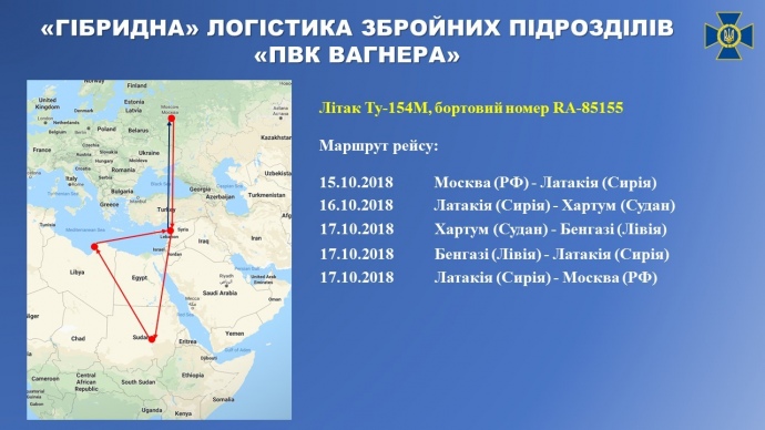 "Так, согласно договору № В218/4/119 от 30.07.2018 (общая сумма 56 млн российских рублей) между указанным выше ООО "М Инвест" и "223 летным отрядом" МО РФ, самолетами Ту-154М (бортовые номера RA- 85041, RA-85155) за пять месяцев 2018 года осуществлено восемь рейсов из Москвы (через российскую авиабазу Хмеймим в сирийской Латакии) в столицу Судана Хартум", - рассказали в СБУ.