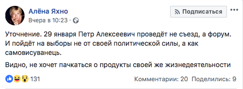 "Уточнение. 29 января Петр Алексеевич проведет не съезд, а форум. И пойдет на выборы не от своей политической силы, а как самовисуванець.
