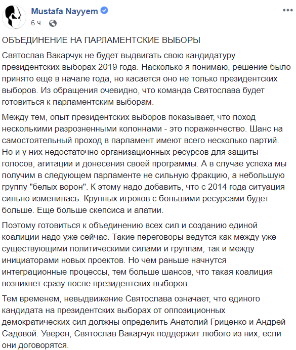 Тем временем, невыдвижение Святослава означает, что единого кандидата на президентских выборах от оппозиционных демократических сил должны определить Анатолий Гриценко и Андрей Садовой. Уверен, Святослав Вакарчук поддержит любого из них, если они договорятся".