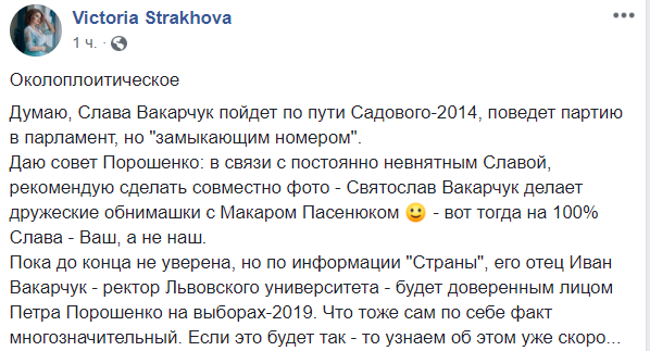 Даю совет Порошенко: в связи с постоянно невнятным Славой, рекомендую сделать совместно фото - Святослав Вакарчук делает дружеские обнимашки с Макаром Пасенюком  :) - вот тогда на 100% Слава - Ваш, а не наш", - пишет банковский аналитик Виктория Страхова.