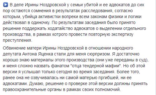 Мать убитой правозищитницы Ирины Ноздровской обвиняет в причастности к смерти дочери бывшего работодателя - члена депутатской группы "Партия "Возрождение" Антона Яценко. Об этом по результатам заседания Временной следственной комиссии по расследованию убийств и нападений на активистов сообщил в Facebook народный депутат Мустафа Найем.