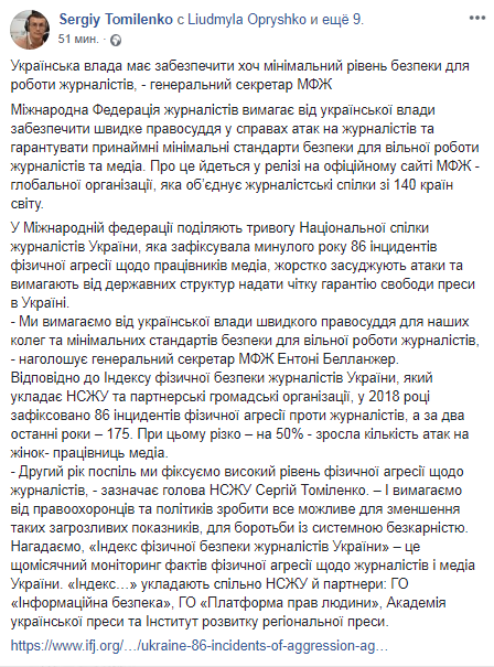 "Согласно Индексу физической безопасности журналистов Украины, который ведет НСЖУ и партнерские общественные организации, в 2018 году зафиксировано 86 инцидентов физической агрессии против журналистов, а за последние два года - 175. При этом резко - на 50% - возросло количество атак на женщин - работниц медиа", - пишет Сергей Томиленко.