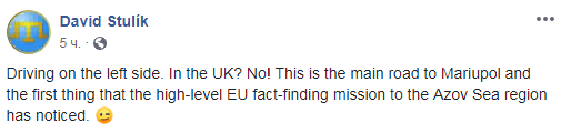 "Вождение по левой стороне. В Соединенном Королевстве? Нет! Это главная дорога в Мариуполь и первое, что заметила миссия ЕС по установлению фактов в регионе Азовского моря", - говорится на его Фейсбук-странице.