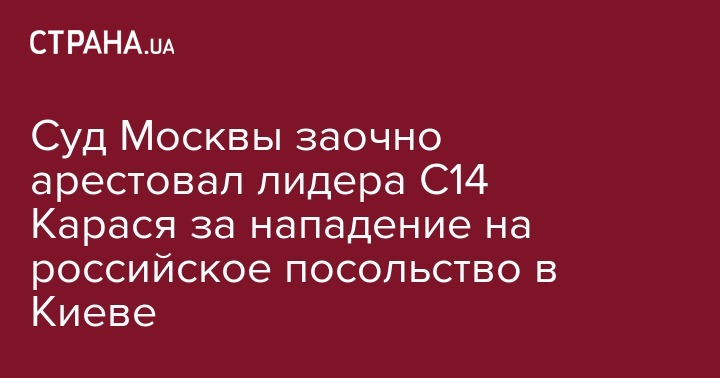 Басманный суд Москвы заочно арестовал украинца, лидера ультраправой организации С14  Евгения Карася, который фигурирует в деле о нападении на российское посольство в Киеве в сентябре 2016 года. Об этом сообщает РБК, ссылаясь на пресс-секретаря суда Юнону Цареву.