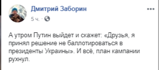 Журналист Дмитрий Заборин моделирует ситуацию в которой Путин заявит "принял решение не баллотироваться в президенты Украины".
