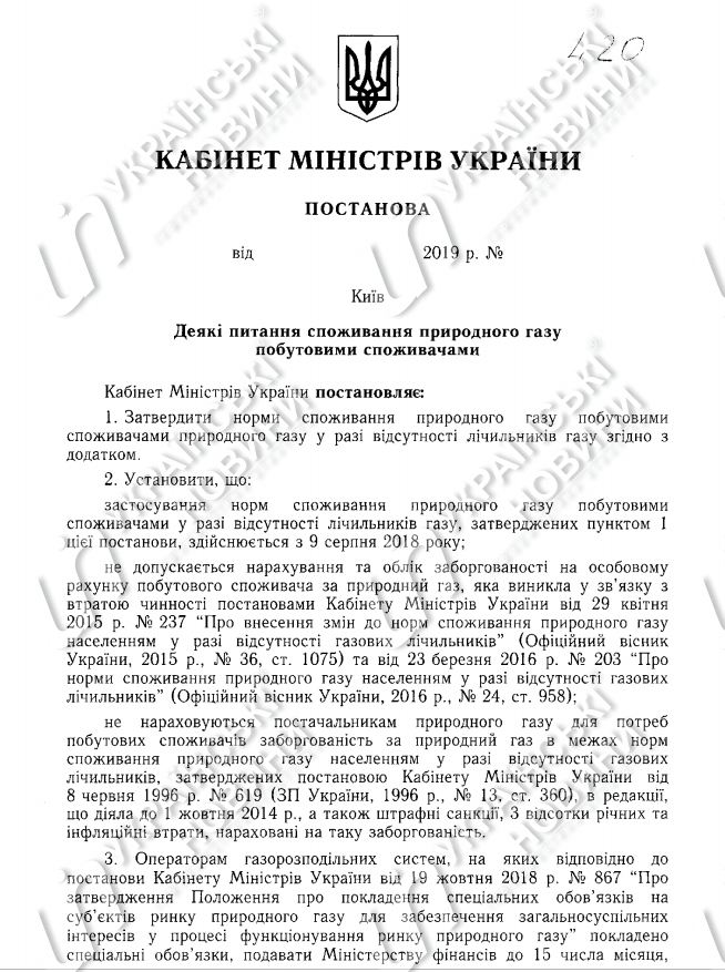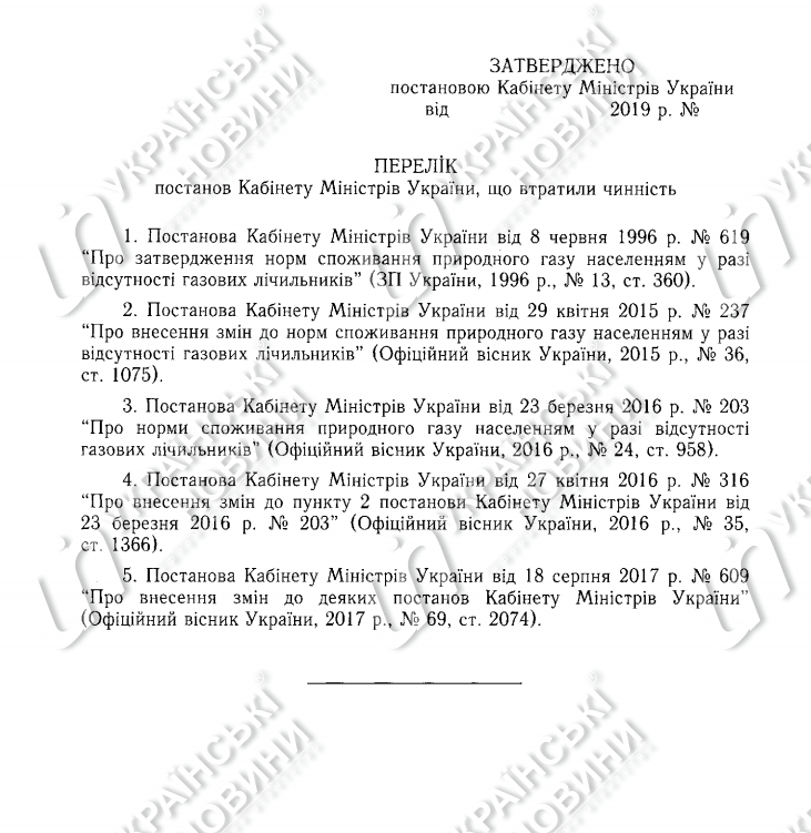 Кабмин установил, что не допускается начисление и учет задолженности на личном счету бытового потребителя за газ, которая возникла в связи с прекращение действия ранее действовавших постановлений правительства по нормам потребления газа населением без счетчиков (принятых в 2015-2016 годах), кроме того, не насчитывается поставщикам газа для бытовых потребителей задолженность за газ в границах норм потребления газа при отсутствии газовых счетчиков, утвержденных постановлением правительства от 8 июня 1996 года №619, в редакции, которая действовала до 1 октября 2014 года, а также штрафные санкции, 3 процента годовых и инфляционные затраты, начисленные на такую задолженность.