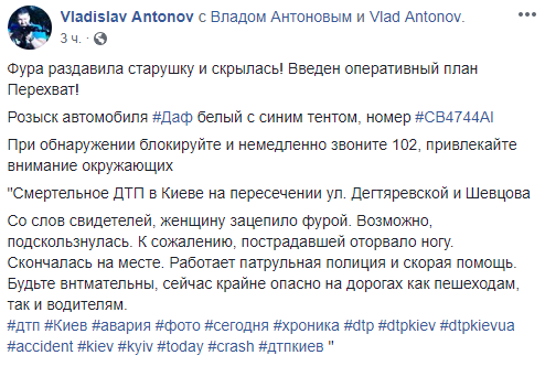 В Киеве 30 января фура насмерть сбила пожилую женщину и скрылась с места происшествия. Об этом сообщает журналист Влад Антонов на своей странице в Facebook.