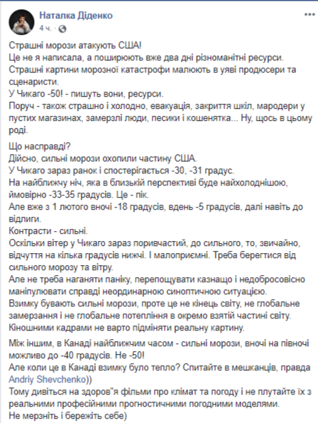 "Страшные картины морозной катастрофы рисуют в воображении продюсеры и сценаристы. В Чикаго -50! - пишут они, ресурсы. Рядом - также страшно и холодно, эвакуация, закрытие школ, мародеры в пустых магазинах, замерзшие люди, собачки и котенка ... Ну, что-то в этом роде. Что на самом деле? Действительно, сильные морозы охватили часть США. В Чикаго сейчас утро и наблюдается -30, -31 градусов. На ближайшую ночь, которая в ближайшей перспективе будет холодной, вероятно -33-35 градусов. Это - пик. Но уже с 1 февраля ночью -18 градусов, днем ​​-5 градусов, дальше даже к оттепели", - написал она.