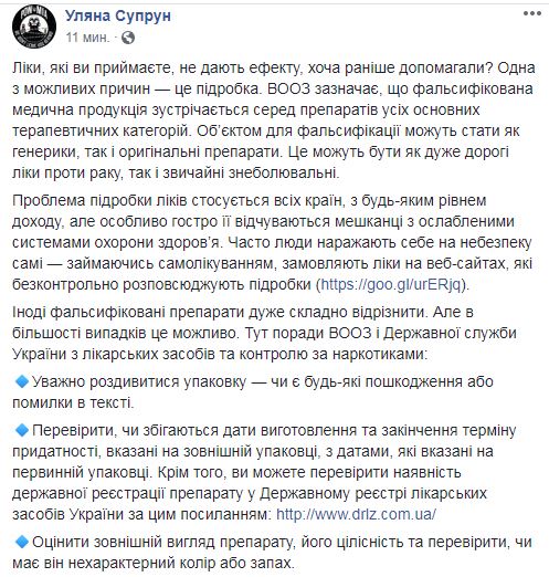 И.о. министра здравоохранения Ульяна Супрун дала советы, как отличить поддельные лекарства от настоящих и что делать в случае обнаружения фальшивки. Об этом она написала в Facebook.