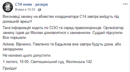 "Исполнители покушения на убийство координатора С14 выйдут под домашний арест! Такая информация ходит по СИЗО и среди правоохранителей. Организатор покушения ездил в Москву договариваться с заказчиком. Судей подкупили. Все порешали. Акимов, Вирченко, Павленко и Бадьянов уже завтра будут дома, или за рубежом. Также параллельно началось заседание по продлению сроков следствия с другим судьей Шум. Именно она по нашей информации взяла деньги и будет отпускать "убийц", - написали накануне на странице  С14.