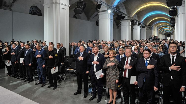 В зале присутствовали премьер-министр Украины Владимир Гройсман, ряд членов Кабинета министров, в частности, министр внутренних дел Арсен Аваков, министр инфраструктуры Владимир Омелян, министр юстиции Павел Петренко, министр образования и науки Лилия Гриневич, вице-премьер Вячеслав Кириленко, которых "Народный фронт" делегировал в состав правительства.
