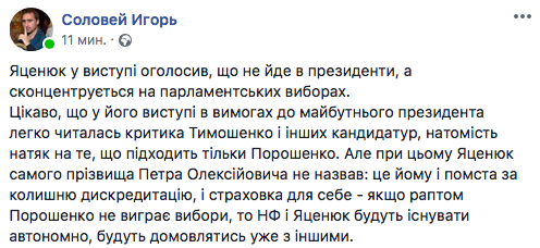 "Яценюк в выступлении объявил, что не идет в президенты, а сконцентрируется на парламентских выборах. Интересно, что в его выступлении в требованиях к будущему президенту легко читалась критика Тимошенко и других кандидатур, а также намек на то, что подходит только Порошенко. Но при этом Яценюк самой фамилии Петра Алексеевича не назвал: это ему и месть за прежнюю дискредитацию, и страховка для себя - если вдруг Порошенко не выиграет выборы, то НФ и Яценюк будут существовать автономно, будут договариваться уже с другими".