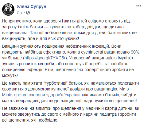 Супрун пообещала усложнить жизнь родителям, подделывающим справки для детей