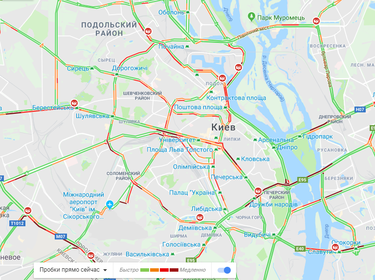 Максимальный уровень заторов наблюдается на улице Крещатик, бульваре Тараса Шевченко и Леси Украинки, улице Льва Толстого, Борщаговской, Саксаганского, Олеся Гончара, проспекте Победы, Воздухофлотском проспекте, улице Прорезной, Ярославов Вал, Богдана Хмельницкого, Михаила Грушевского, Костельной, Михайловской , Владимирской, Большой Житомирской, Набережном шоссе, улице Институтской, Шелковичной, Бассейной, Большой Васильковской, Антоновича, Михаила Омельяновича-Павленко и Набережно-Рыбацкой.