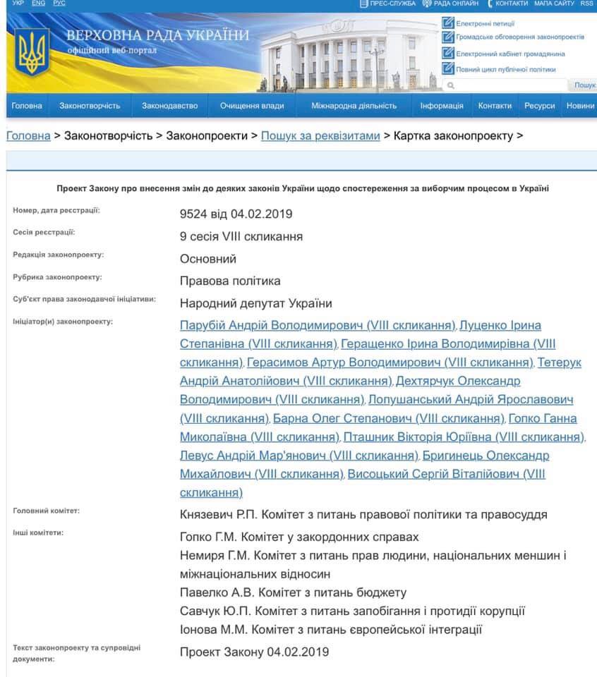 В Верховной Раде зарегистрировали законопроект № 9524, который нацелен исключить участие наблюдателей из России на президентских и парламентских выборах в Украине. Об этом сообщила первый вице-спикер Верховной Рады Ирина Геращенко на своей странице в Facebook.