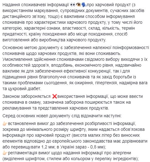 "Этот закон позволит обеспечить высокий уровень защиты здоровья и интересов потребителей путем предоставления всей необходимой информации для осуществления потребителями сознательного выбора пищевых продуктов и ввести ответственность операторов рынка, отвечающих за информацию о пищевых продуктах, за введение потребителей в заблуждение", - написал замглавы аграрного комитета народный депутат Александр Бакуменко (фракция БПП) на своей странице в Facebook.