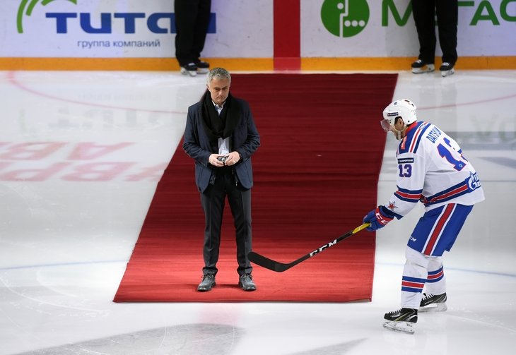 Жозе Моуринью живописно шлепнулся на лед перед хоккейным матчем. Фото и видео