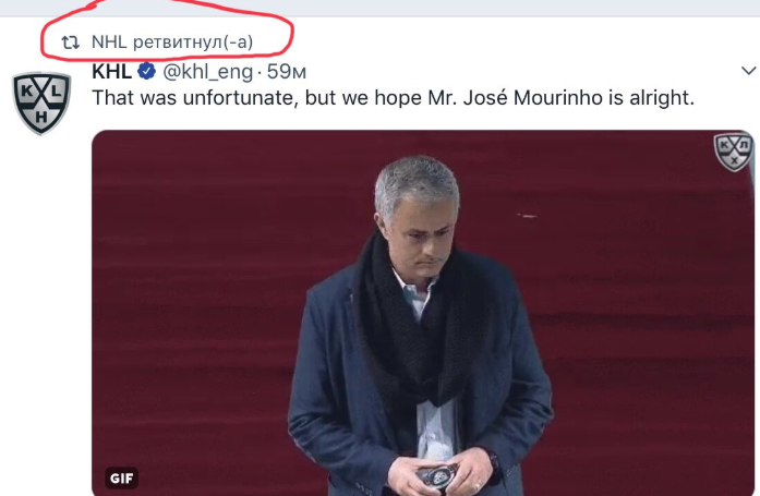 Падение Жозе Моуринью прославило КХЛ на весь мир - гифку с падением Моуринью ретвитнул даже официальный аккаунт Национальной хоккейной лиги (НХЛ).