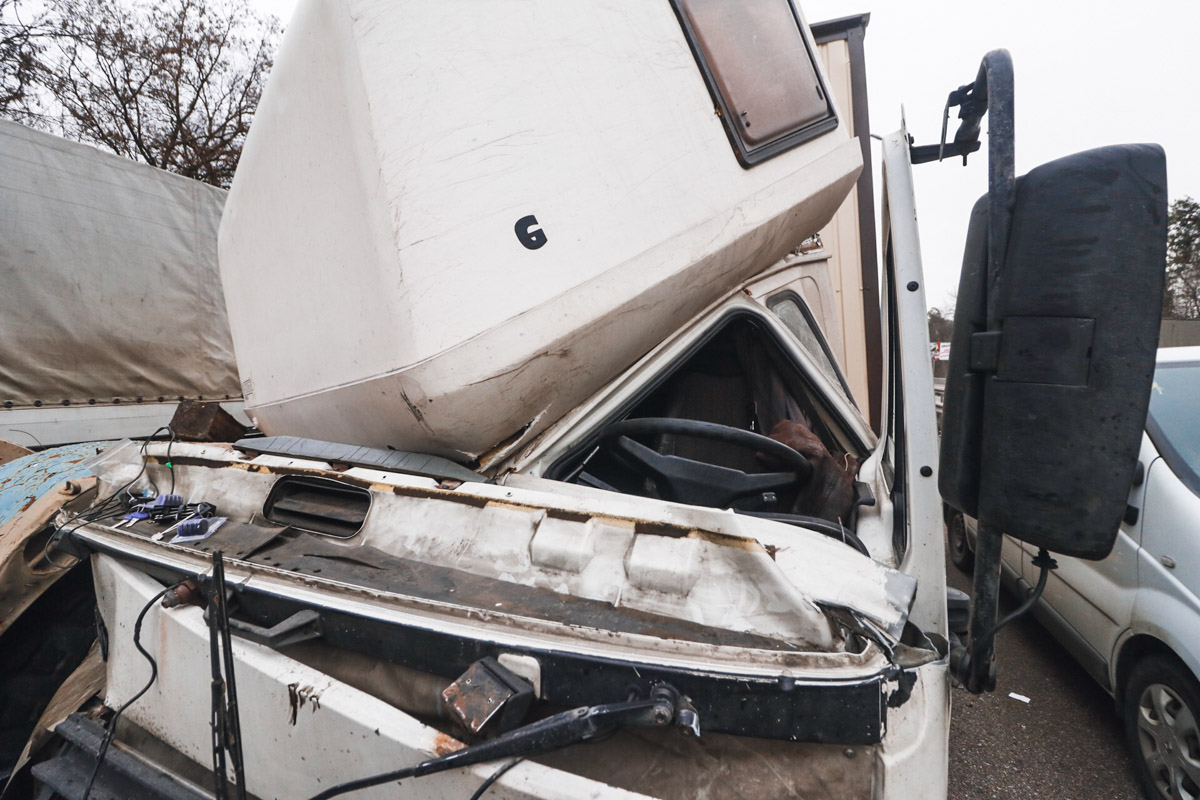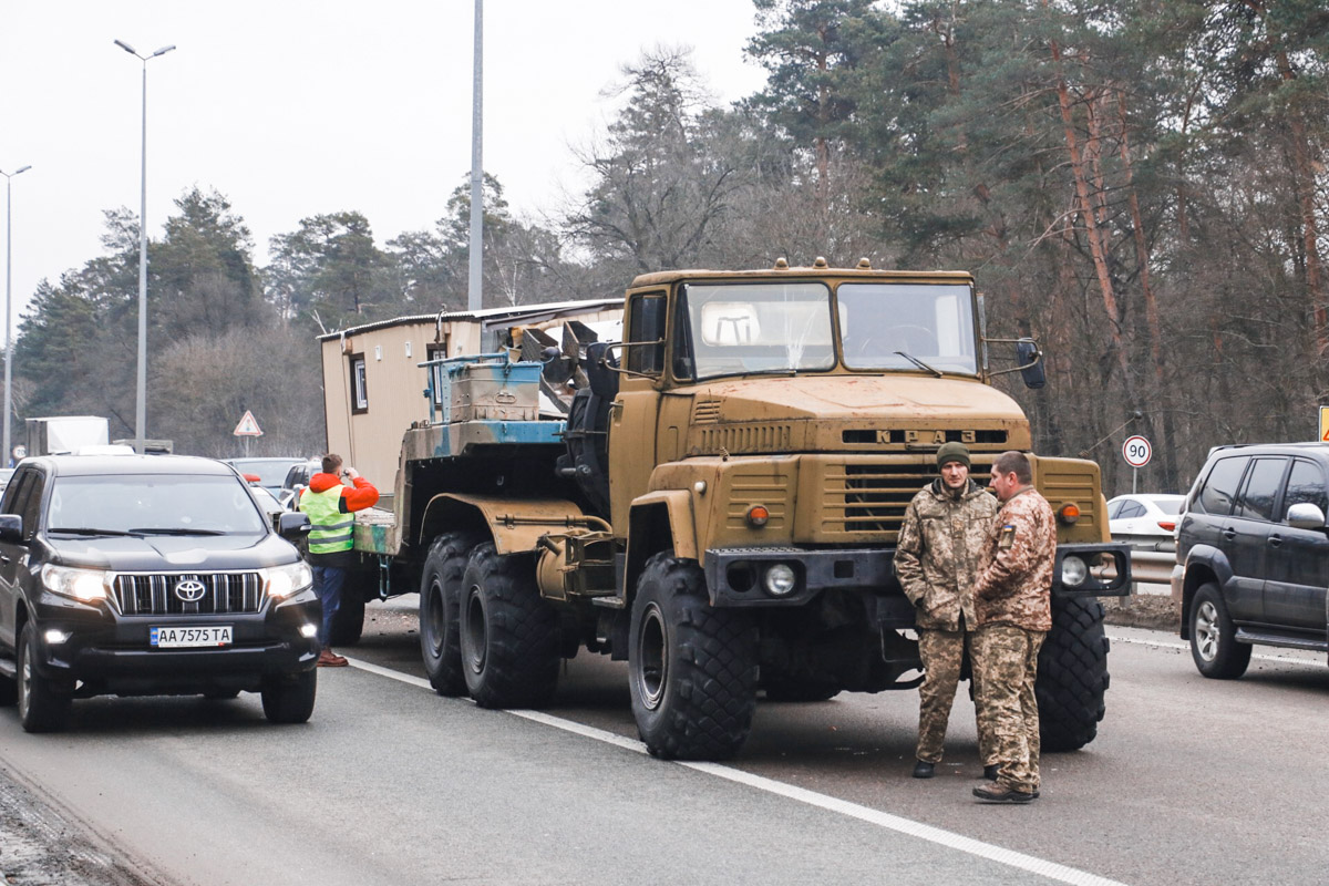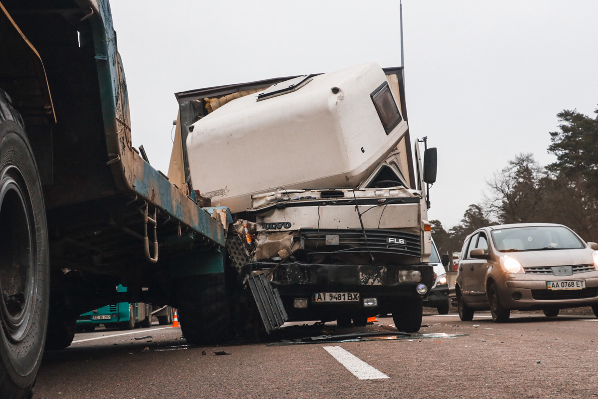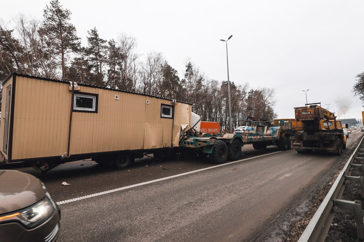 Тягач двигался из Киева по Житомирскому шоссе. В 300 метрах от поста полиции его догнал крупногабаритный грузовик Volvo, который перевозил строительный вагончик. От удара у грузовика смяло кабину. Водитель успел вывернуть руль и уйти немного в крайний ряд, поэтому основной удар пришелся на пассажирскую часть, где, к счастью, никого не было.  КрАЗ двигался не в военной колоне, тягач менял пункт дислокации.