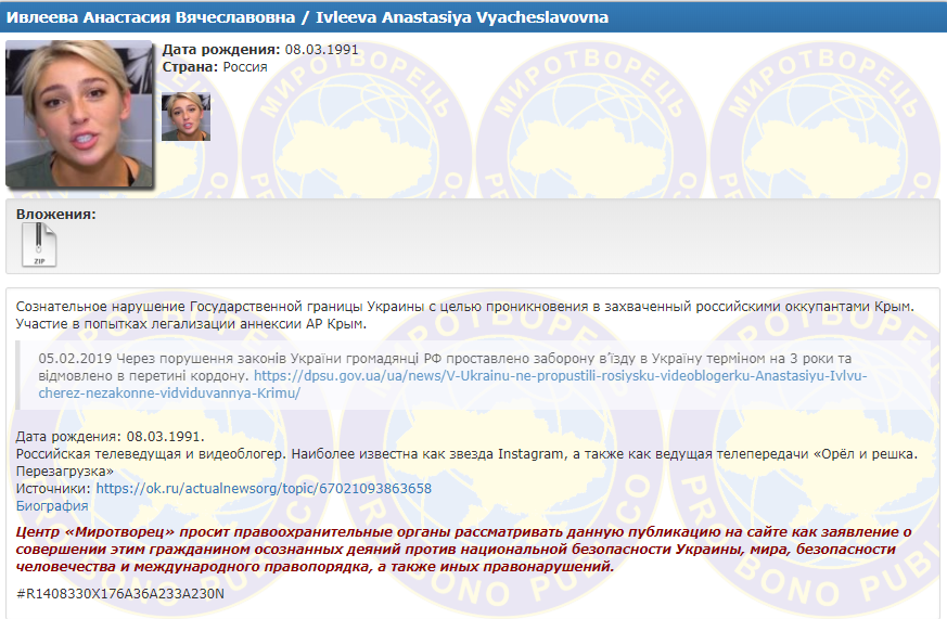Блогершу Настю Ивлееву внесли на Миротворец и запретили въезжать в Украину