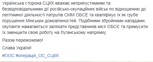 В понедельник, 4 февраля, в районе Золотого Луганской области патруль СММ ОБСЕ попал под обстрел. Об этом сообщается на странице операции Объединенных сил в соцсети Facebook.