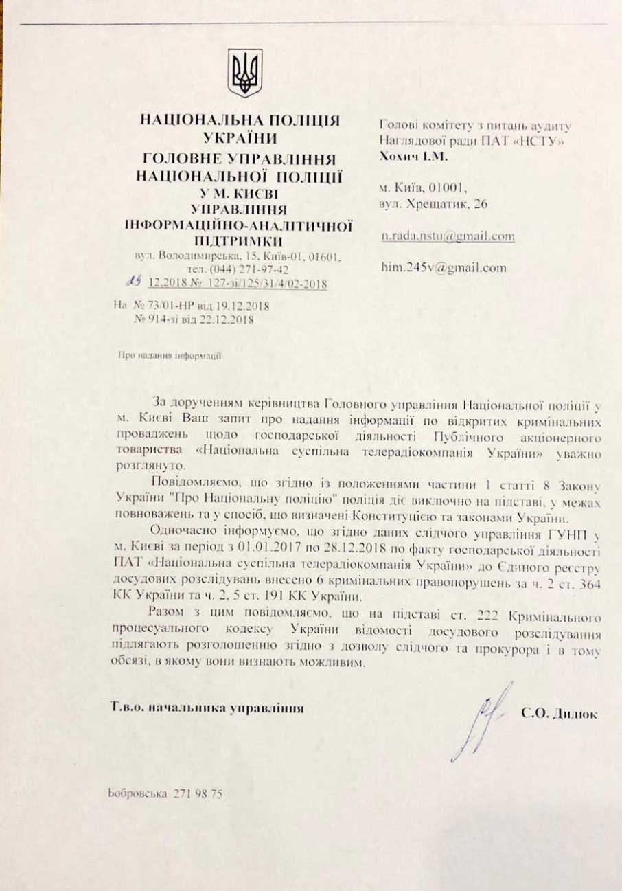 "... Согласно данным следственного управления ГУНП в Киеве, за период с 01.01.2017 по 28.12.2018 по факту хозяйственной деятельности ПАО "Национальная общественная телерадиокомпания Украины" в Единый реестр досудебных расследований внесено 6 уголовных правонарушений по ч. 2 ст. 364 УК Украины и ч. 2,5 ст. 191 УК Украины... Данные досудебного расследования подлежат разглашению согласно с разрешением следователя и прокурора в том объеме, в котором они признаются возможным", - сказано в документе.