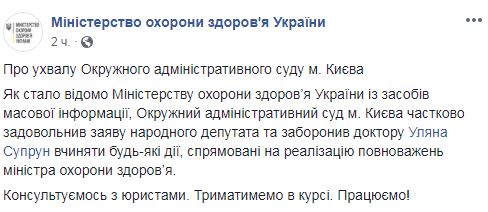 "Как стало известно Министерству здравоохранения Украины из средств массовой информации, Окружной административный суд Киева частично удовлетворил заявление народного депутата и запретил доктору Ульяне Супрун совершать любые действия, направленные на реализацию полномочий министра здравоохранения", - отмечается в сообщении. Там добавляют, что "консультируются с юристами". "Будем держать в курсе. Работаем!", - резюмировали в Минздраве.