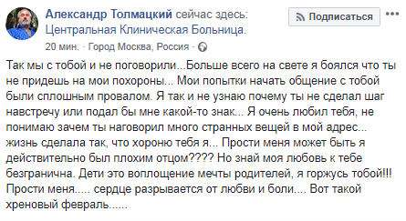 "Так мы с тобой и не поговорили... Больше всего на свете я боялся, что ты не придешь на мои похороны... Мои попытки начать общение с тобой были сплошным провалом. Я так и не узнаю, почему ты не сделал шаг навстречу или подал бы мне какой-то знак... Я очень любил тебя, не понимаю, зачем ты наговорил много странных вещей в мой адрес... Жизнь сделала так, что хороню тебя я... Прости меня, может быть, я действительно был плохим отцом???? Но знай, моя любовь к тебе безгранична. Дети это воплощение мечты родителей, я горжусь тобой!!! Прости меня..... сердце разрывается от любви и боли.... Вот такой хреновый февраль...", - написал он.