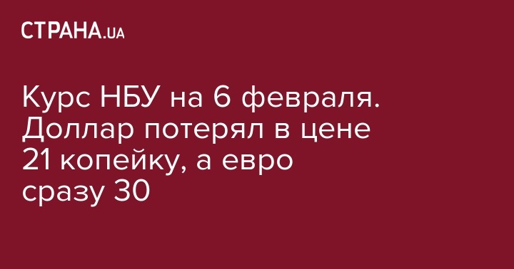 Так, НБУ установил курс доллара на уровне 27,21 грн/$, то есть на 21 копейку дешевле, чем вчера, 5 февраля. Евро сегодня стоит 31,08 грн за единицу - на 30 копеек меньше, чем днем ранее.