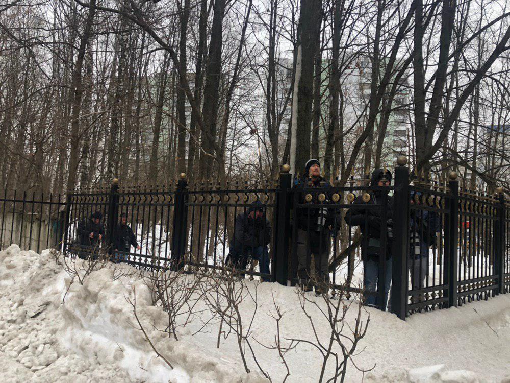 Журналистов внутрь помещения не пустили и они вынуждены были снимать происходящее из-за забора.