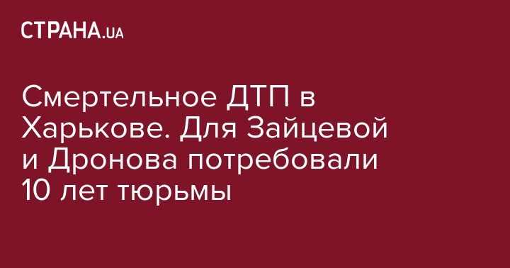 6 февраля в Харькове прокуратура потребовала признать Елену Зайцеву и Геннадия Дронова виновными в смертельном ДТП, произошедшем на центральной улице города в октябре 2017 года, жертвами которого стали 6 человек. Обвинение просит суд назначить для виновников аварии максимально суровое наказание, предусмотренное Уголовным кодексом Украины. Об этом сообщает "Интерфакс-Украина".