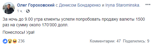 Один из сооснователей Мonobank Олег Гороховский 7 февраля сообщил, что за ночь до 9:00 утра клиенты успели попробовать продажу валюты 1500 раз на сумму около 170 000 долларов.