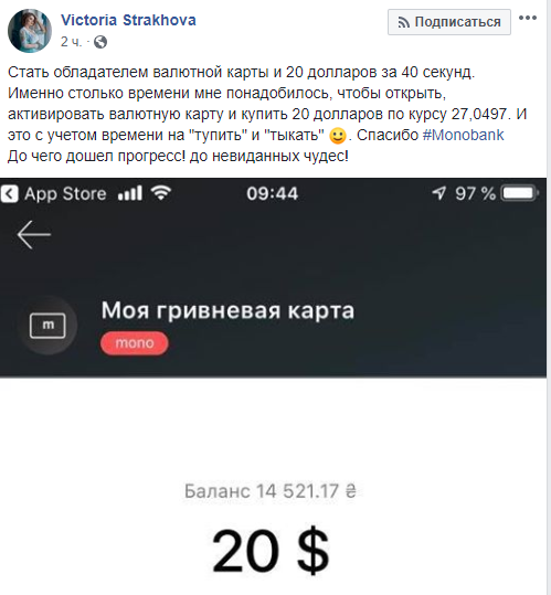 Бывшая сотрудница "Приватбанка" Виктория Страхова отчиталась, что сегодня она купила 20 долларов в Monobank по курсу 27,0497.