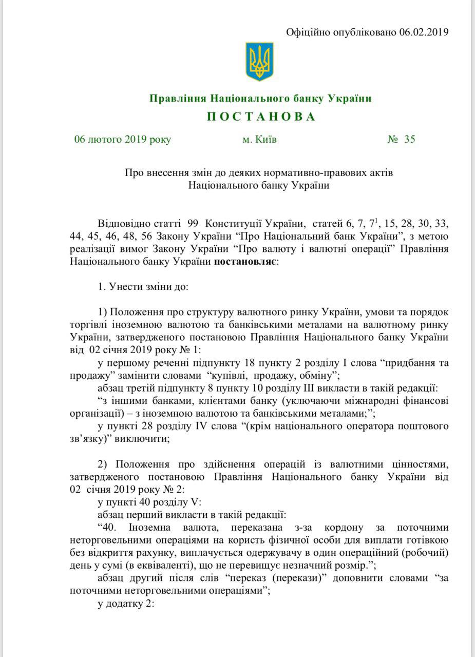 - снижена норма обязательной продажи валютной выручки бизнеса с 50% до 30% с 1 марта 2019 года (с 7 по 28 февраля Нацбанк продлил старое требование по конвертации половины выручки);