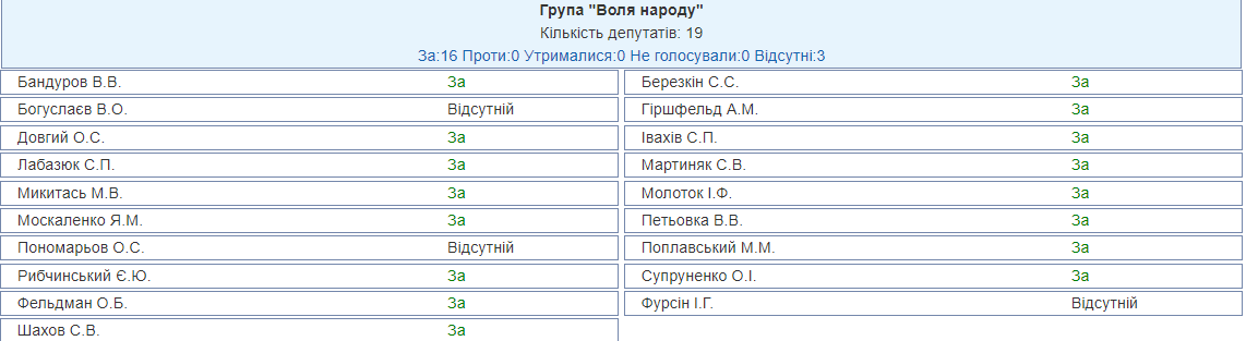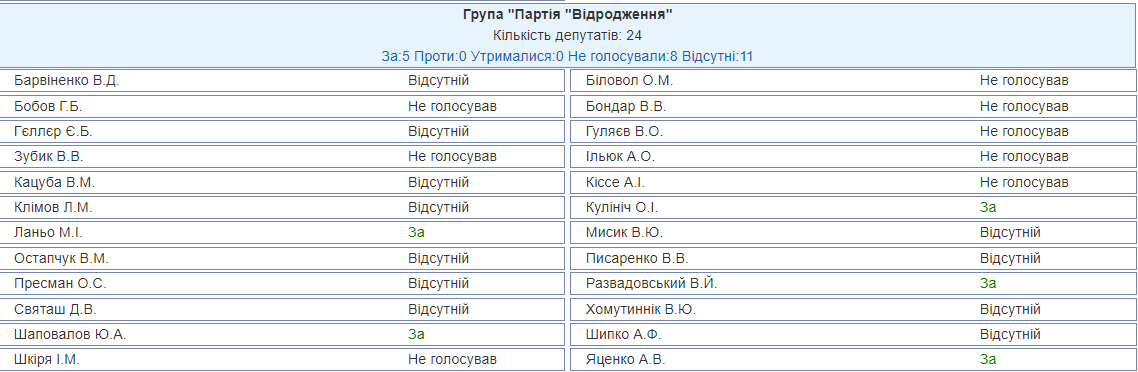 "Видродження" из 24 депутатов дало только 5 голосов "за". Как уже рассказывала "Страна", участники этой группы выдвигали власти некоторые условия, которые, судя по голосованию, выполнены не были.