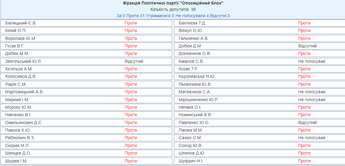 Из тех же, кто был против - это "Оппозиционный блок" и выходцы из него: внефракционные Бойко, Дунаев, Иоффе и Левочкин (все они сейчас входят в "Оппозиционную платформу - За Жизнь").