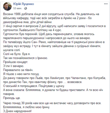 Луценко рассказал историю знакомства со своей будущей женой. Это случилось в общежитии Львовского Политеха - они всю ночь провели на кухне за разговором, а на утро Ирина Луценко сказала: "Бляяяяха, я думала ты будешь приставать. А ты всю ночь говорил". "Спустя более 30 лет нам все еще не хватает времени договорить обо всем. Бляяяяха, я люблю мою Ирину", - написал Генпрокурор.