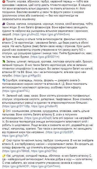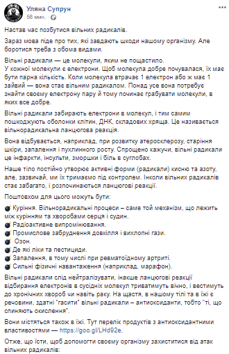 По словам Супрун, свободные радикалы следует нейтрализовать, иначе цепные реакции отбора электронов у соседних молекул будут продолжаться вечно, и вести к хроническим болезням или даже раку.а.
