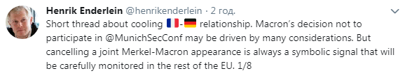 По данным немецкого издания, ранее упоминались "трудности с расписанием", однако "есть впечатление охлаждения германо-французских отношений". Как пояснил доверенное лицо Макрона Хенри Ендерляйн, отказ от совместного выступления является "символическим сигналом".